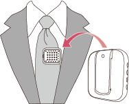 - ② 本体裏のクリップでネクタイ、ポケットなどに挟み、身に着ける。
