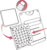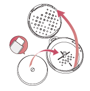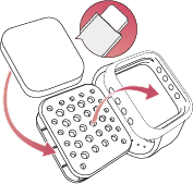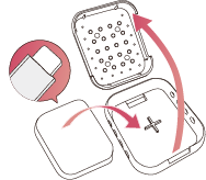 - ① 付属のフローライト(含浸剤)を包装より取り出し、本体フタ部分をつまんでまっすぐ引き開け、中にセットする。開ける際、ゴムを直接引っ張らない。